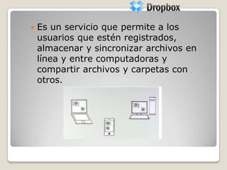 Este documento describe Dropbox, un servicio de almacenamiento en la nube que permite a los usuarios almacenar, sincronizar y compartir archivos entre dispositivos de forma gratuita. Dropbox sincroniza automáticamente los archivos entre computadoras y dispositivos, permitiendo el acceso y edición de archivos desde cualquier lugar. El servicio ofrece funciones como compartir archivos y carpetas con otros usuarios, ver versiones anteriores de archivos, y obtener enlaces públicos para compartir archivos con personas sin cuenta de Dropbox.