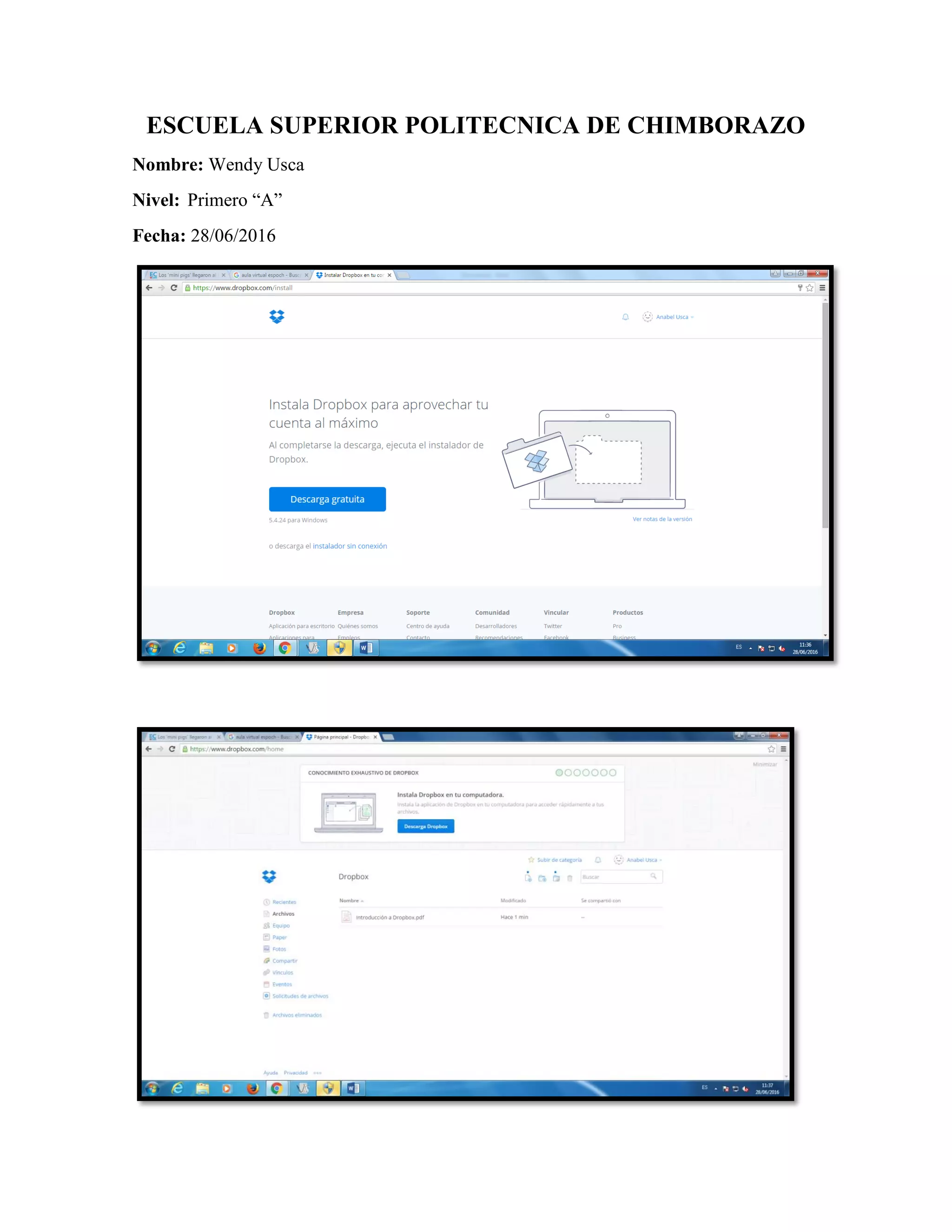 La estudiante Wendy Usca de la Escuela Superior Politécnica de Chimborazo está en el primer año del nivel A. El documento proporciona detalles sobre su información académica como su nombre, la escuela a la que asiste y el grado y sección en la que está actualmente.