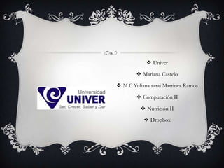 Dropbox es una herramienta de sincronización de archivos que crea una carpeta en el computador que se mantiene sincronizada con copias de los archivos en la nube a través de Internet. Esto permite acceder a los archivos desde cualquier computador, y mantiene las versiones anteriores de los archivos por si son necesarias. Dropbox ofrece cuentas gratuitas y de pago con diferentes niveles de almacenamiento en la nube, y se puede usar en computadoras Mac, Windows, Linux, y dispositivos iOS y Android.