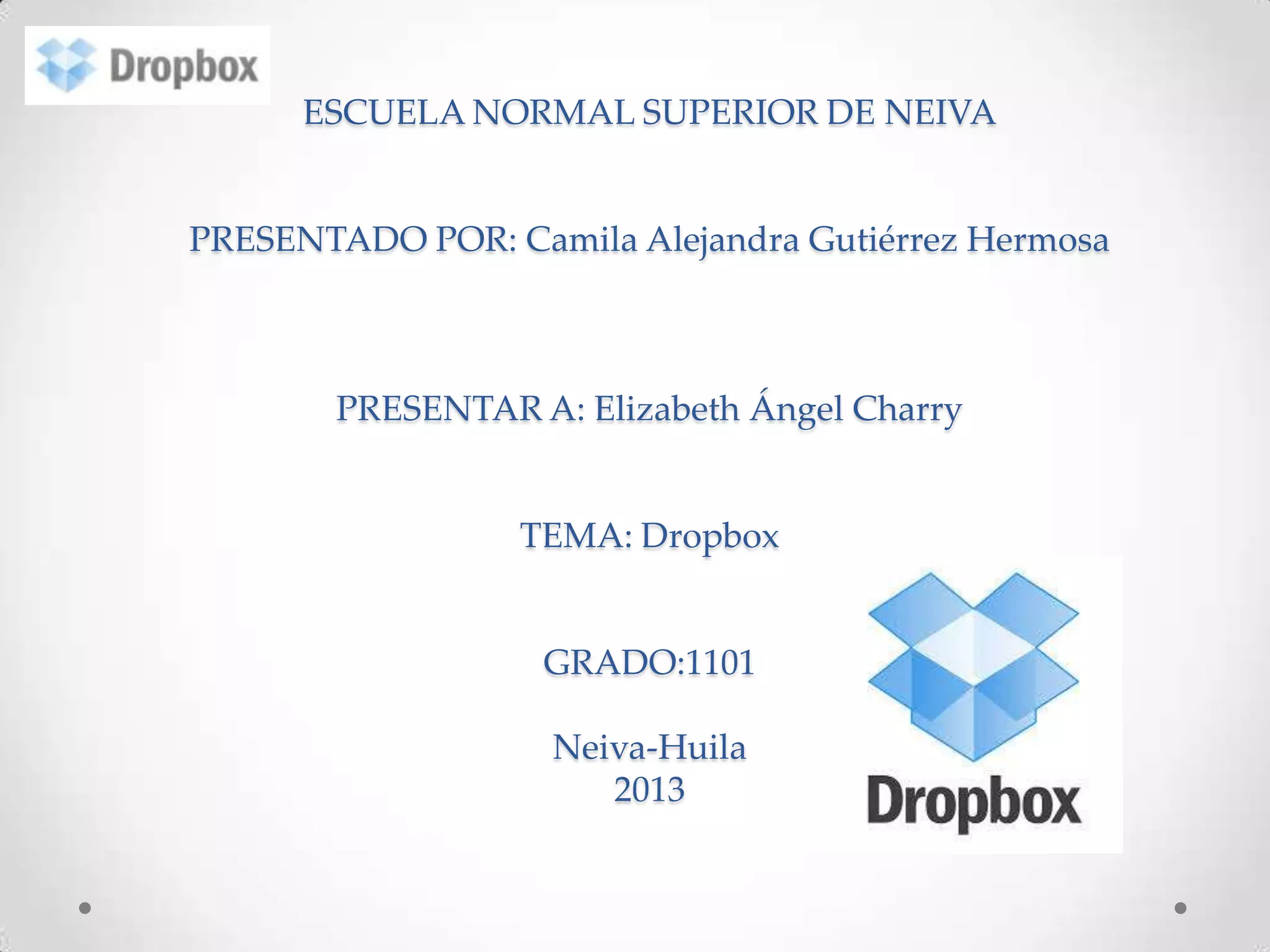 Dropbox es una herramienta que permite sincronizar archivos a través de un directorio virtual en la nube, lo que significa que los archivos pueden accederse desde cualquier ordenador en el mundo. Esto permite tener siempre una copia de los archivos disponibles sin importar la ubicación. Dropbox también permite la colaboración en archivos entre trabajadores sin necesidad de enviar copias repetidas. Es un servicio gratuito que permite almacenar archivos en Internet y accederlos desde cualquier dispositivo conectado a la cuenta.