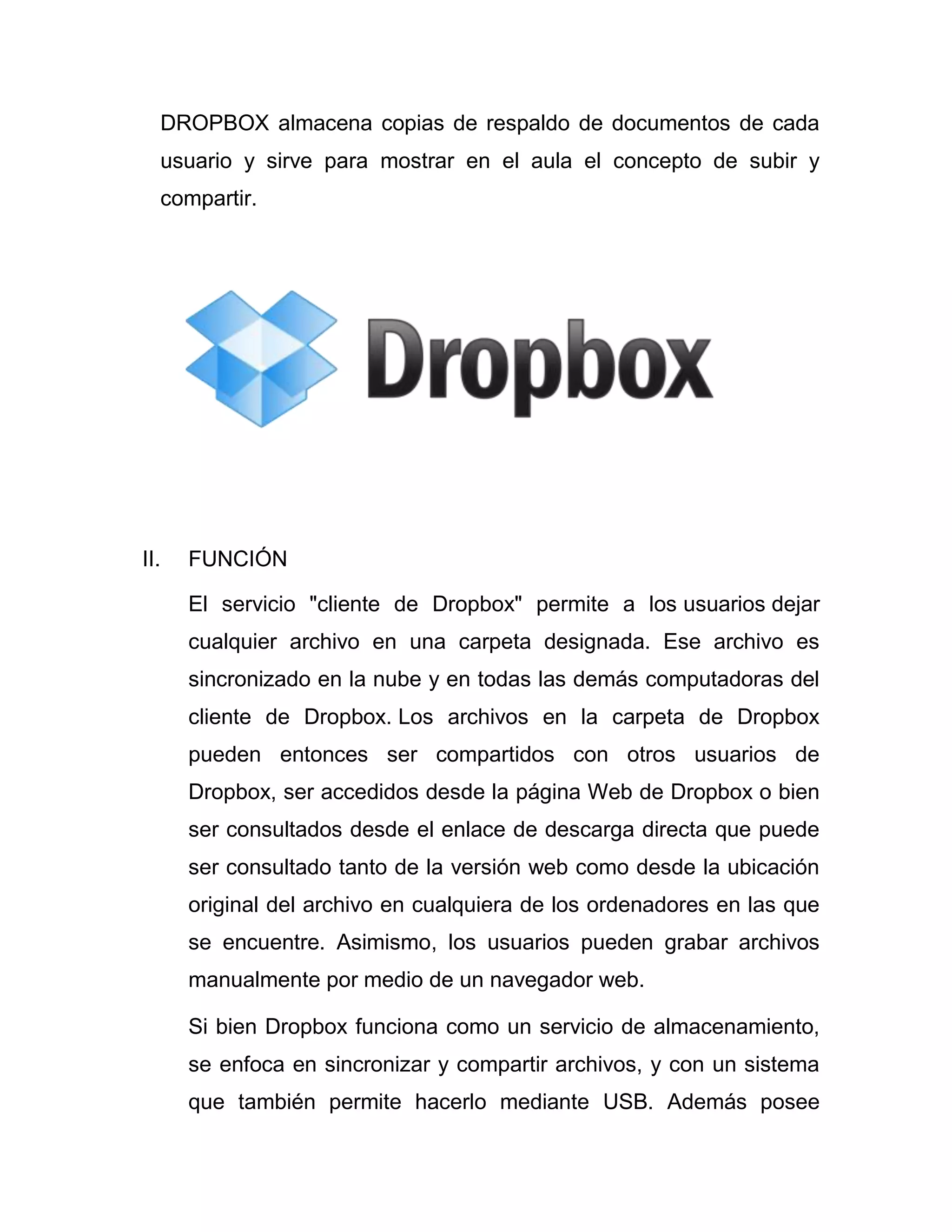 Este documento proporciona una introducción a Dropbox, un servicio de almacenamiento y sincronización en la nube. Explica que Dropbox permite a los usuarios almacenar y compartir archivos entre dispositivos a través de una carpeta sincronizada. También describe las funciones principales como la sincronización automática de archivos, la capacidad de compartir archivos y recuperar versiones anteriores. Finalmente, brinda información sobre los diferentes tipos de cuentas de Dropbox y cómo los usuarios pueden comenzar a usar el servicio.