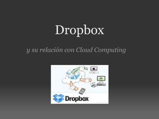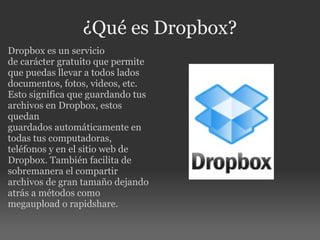 Dropbox es un servicio gratuito que permite sincronizar y compartir archivos entre diferentes dispositivos a través de almacenamiento en la nube. Los usuarios pueden acceder y compartir fácilmente archivos desde cualquier lugar mediante la instalación de Dropbox en sus dispositivos y la creación de una cuenta. El cloud computing se refiere al almacenamiento y procesamiento de datos en servidores remotos que se accede a través de Internet, y Dropbox es un ejemplo de aplicación de este concepto al permitir almacenar y sincronizar archivos de forma externa a