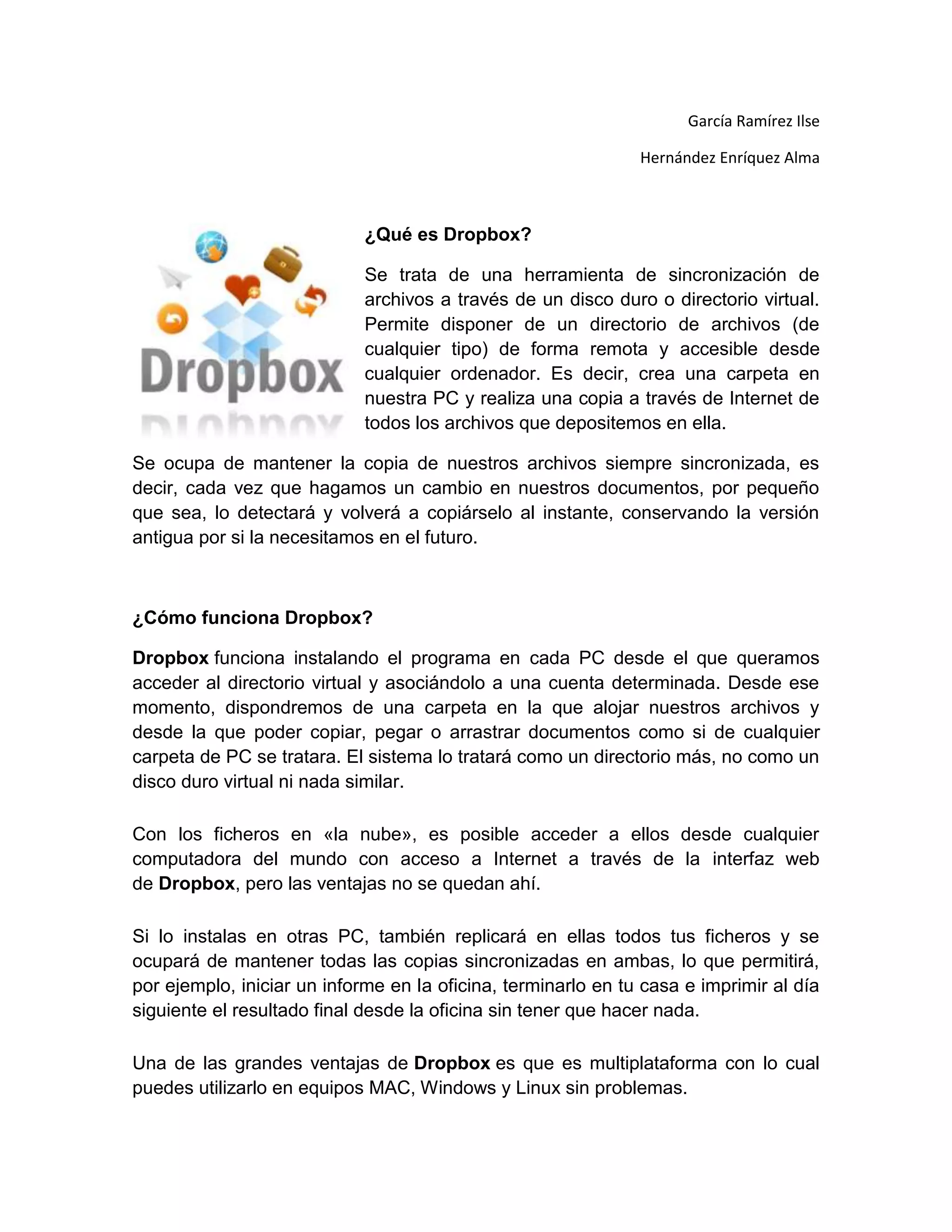 Dropbox es una herramienta de sincronización de archivos que crea un directorio virtual en la nube para almacenar y acceder archivos desde cualquier dispositivo con internet. Mantiene copias actualizadas de los archivos en todos los dispositivos asociados a la cuenta, permitiendo editar documentos de forma colaborativa. Google Docs es una aplicación en línea gratuita de Google que permite crear y editar documentos, hojas de cálculo y presentaciones en forma colaborativa desde cualquier dispositivo con solo tener una cuenta de Google y acceso a internet.