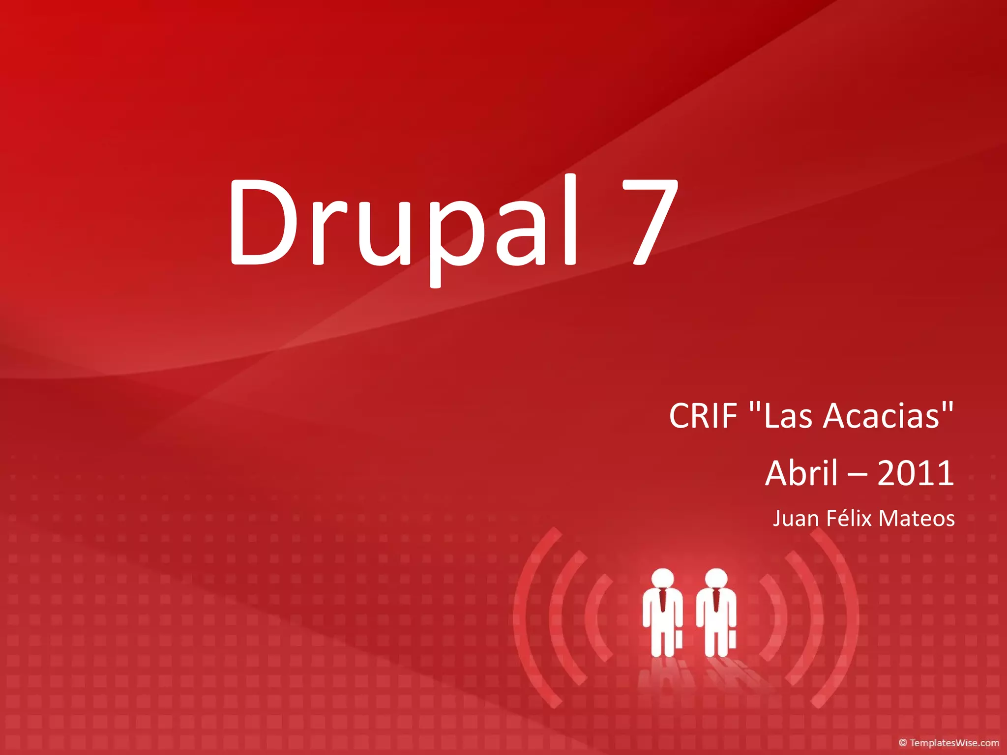 Drupal es un gestor de contenidos web, desarrollado en PHP, que permite una extensa personalización a través de módulos contribuidos. La versión 7 mejora la usabilidad de la interfaz de administración, aunque su complejidad puede ser un desafío para configuraciones avanzadas. La próxima versión, Drupal 8, se enfocará en la adaptabilidad a dispositivos móviles y una integración más sencilla con servicios en la nube.