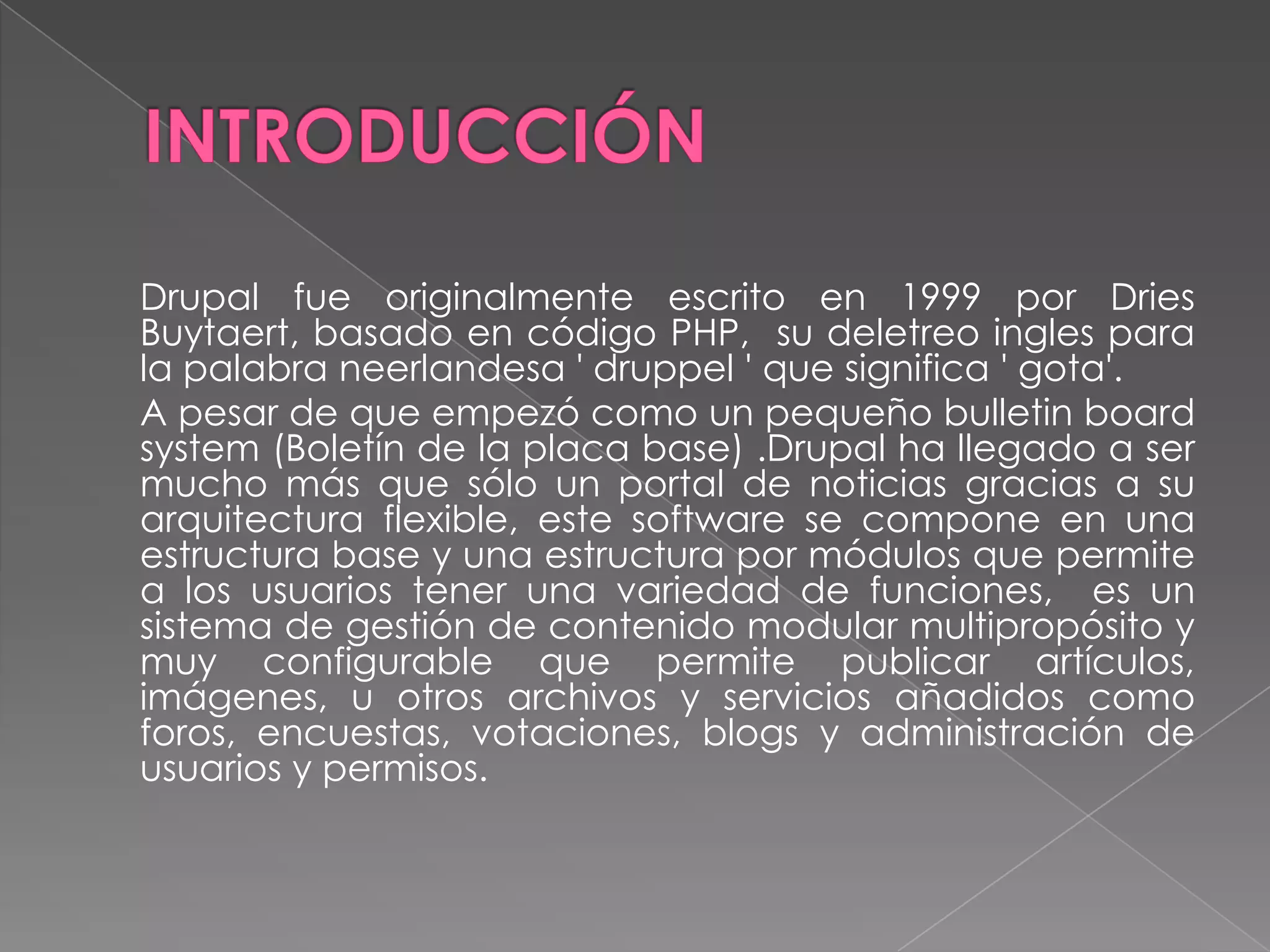 Drupal es un sistema de gestión de contenidos libre y de código abierto que permite publicar y administrar contenido web de forma flexible a través de módulos. Fue creado en 1999 y está escrito en PHP, usando una arquitectura modular que facilita la adición de funcionalidades mediante módulos. Es ampliamente usado por sitios grandes debido a su flexibilidad, seguridad y rendimiento.