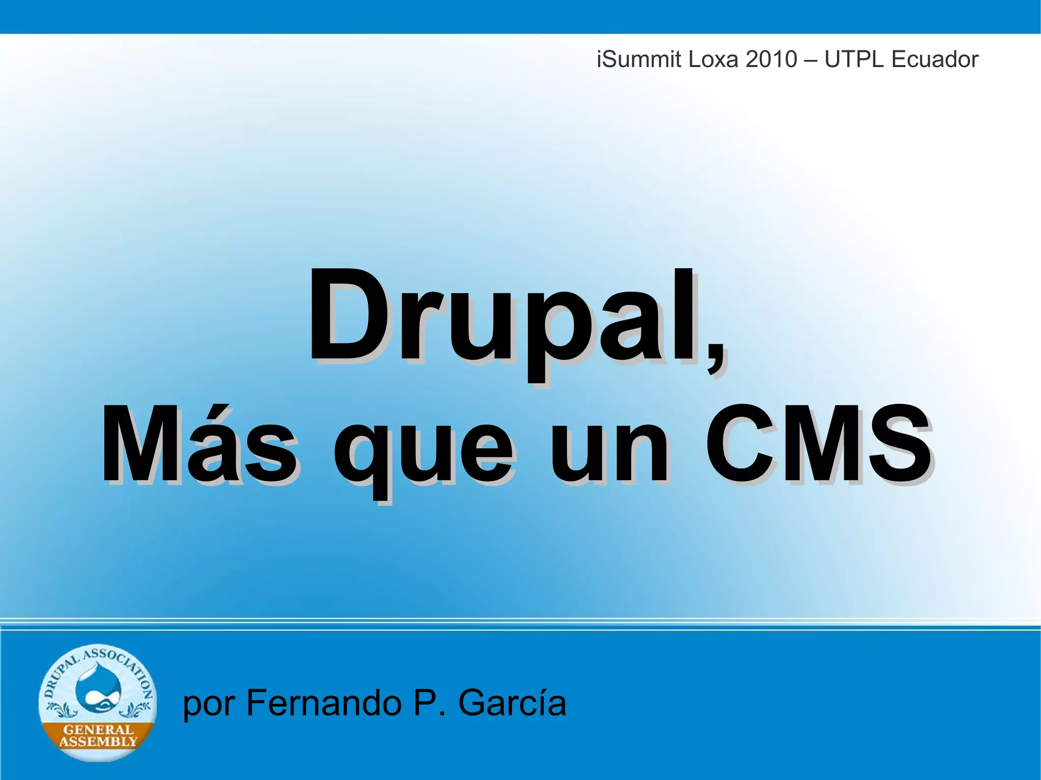 Este documento presenta una introducción a Drupal, una plataforma de gestión de contenidos de código abierto. Explica que Drupal es modular y extensible, con código de alta calidad basado en estándares. También describe algunas de las características clave de Drupal como su infraestructura, roles en el desarrollo, API y comunidad activa de desarrolladores.