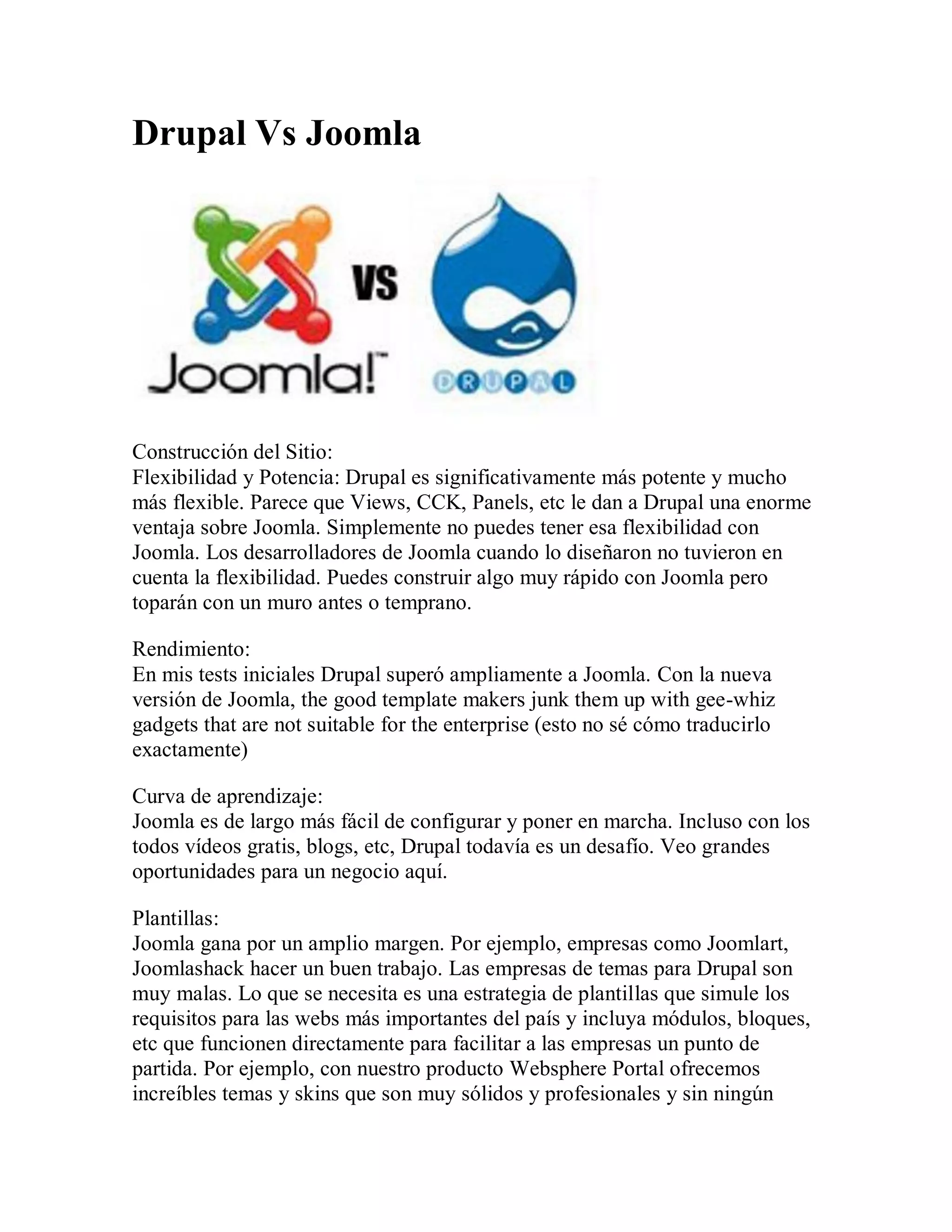 Drupal ofrece mayor flexibilidad y potencia que Joomla, pero también tiene una curva de aprendizaje más pronunciada. Joomla es más fácil de implementar y ofrece mejores plantillas, mientras que Drupal tiene mejores herramientas para la construcción y organización de contenido. Al final, Joomla es una mejor opción para sitios simples que necesiten implementarse rápido, mientras que Drupal es más adecuado para sitios más complejos y escalables.