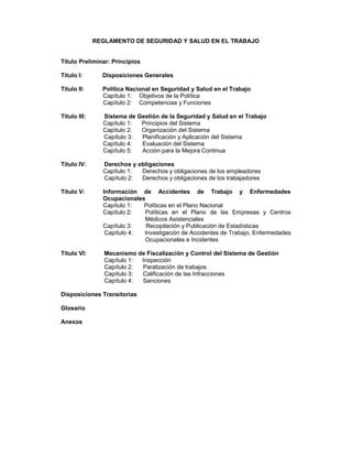 1) El documento aprueba el Reglamento de Seguridad y Salud en el Trabajo, el cual establece normas para prevenir riesgos laborales. 2) El reglamento comprende seis títulos y disposiciones transitorias que definen derechos, obligaciones y el sistema de gestión de seguridad y salud ocupacional. 3) Se encomienda a entidades públicas como los Ministerios de Trabajo y Salud la promoción de una cultura preventiva y el control de cumplimiento de la normativa sobre seguridad laboral.