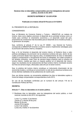 Este decreto supremo declara días no laborables compensables para los trabajadores del sector público en el año 2013, incluyendo los lunes 11 y 12 de febrero, jueves 27 y 29 de junio, martes 30 de julio, jueves 29 de agosto, lunes 7 de octubre y lunes 30 y 31 de diciembre. Estos días serán compensados con horas de trabajo en la semana posterior. También se permitirá a los centros de trabajo privados acogerse a esta medida previo acuerdo entre empleadores y trabajadores.