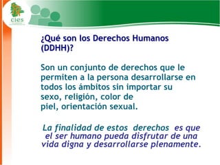 Este documento define los derechos sexuales y reproductivos como aquellos derechos que permiten a las personas tener una vida sexual y reproductiva libre de violencia, riesgos y discriminación. Explica que estos derechos forman parte de los derechos humanos y cubren aspectos como la salud, la educación, la privacidad y la libertad de tomar decisiones sobre la sexualidad y la reproducción. También enumera 12 derechos específicos en este ámbito y señala algunas formas en que pueden ser violados.