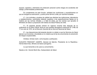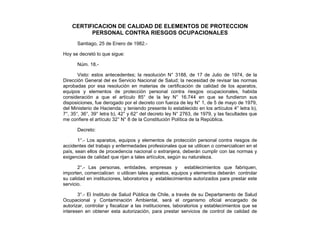 Este decreto establece nuevas normas para la certificación de calidad de elementos de protección personal contra riesgos ocupacionales. Se requiere que estos elementos cumplan con las normas de calidad aplicables a su naturaleza y que sean controlados por instituciones autorizadas. El Instituto de Salud Pública de Chile será el encargado de autorizar y fiscalizar a estas instituciones, y podrá revocar su autorización si no cumplen. Los controles de calidad deberán ceñirse a las normas oficiales o aquellas aprob