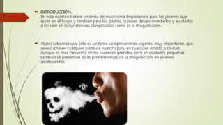 El documento discute las causas de la drogadicción en los adolescentes. No existe una causa única, sino factores como la curiosidad por experimentar, la presión de los pares, la búsqueda de placer y un control familiar inconsistente que pueden conducir al consumo de drogas. Una buena comunicación entre padres e hijos puede disminuir el riesgo.
