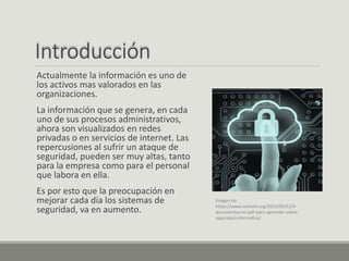 Este documento trata sobre la seguridad de la información. Explica que la información es un activo valioso para las organizaciones que debe protegerse. Describe los principios de confidencialidad, integridad y disponibilidad que son fundamentales para la seguridad. También cubre amenazas comunes como malware, y métodos para proteger la información como criptografía, certificados digitales, planes de continuidad del negocio y recuperación ante desastres.