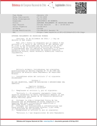 Este documento describe las modificaciones realizadas al Reglamento de Seguridad Minera de Chile de 1985. Se introducen cambios en la definición de términos clave, el alcance de aplicación y las funciones del Servicio Nacional de Geología y Minería en relación a la seguridad en la industria minera. El objetivo es actualizar la normativa para mejorar la protección de la vida e integridad de los trabajadores mineros y las instalaciones.