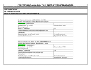 Este proyecto de aula busca promover la paz y la convivencia entre los estudiantes de grados 5° de la Institución Educativa La Florida. El proyecto utiliza herramientas TIC como videos e indagaciones en la web para enseñar a los estudiantes sobre el valor de las normas y los acuerdos para la convivencia en la escuela y la comunidad. El proyecto evalúa los conocimientos de los estudiantes antes y después de las actividades para medir su efectividad.