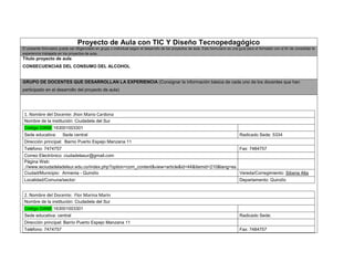 Este documento describe un proyecto de aula realizado por tres docentes de la Institución Educativa Ciudadela del Sur sobre las consecuencias del consumo de alcohol. El proyecto involucró a 20 estudiantes de grados 9 a 11 y utilizó herramientas TIC como Prezi, Bubbl y GoAnimate. Los estudiantes crearon cuentos, mapas conceptuales y videos para aumentar su comprensión sobre los efectos físicos y de comportamiento del alcoholismo. Las evaluaciones iniciales y finales mostraron que los estudiantes mejoraron su conocimiento sobre este