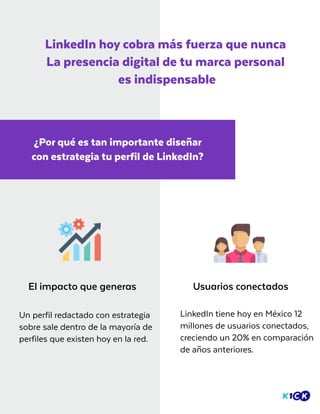 Este documento ofrece consejos para crear un perfil irresistible en LinkedIn. Explica que LinkedIn es una plataforma importante para construir una marca personal y encontrar oportunidades laborales y clientes. Recomienda definir objetivos claros para el perfil, como ser visible para reclutadores o atraer clientes potenciales. Además, enfatiza la importancia de elementos como la foto y descripción del perfil para generar una buena primera impresión y conexiones relevantes.