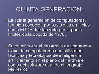La quinta generación de computadoras fue lanzada por Japón a finales de los 70 con el objetivo de desarrollar máquinas que utilizaran inteligencia artificial en el hardware y software usando el lenguaje PROLOG. El proyecto duró 11 años pero no logró los resultados esperados, ya que las computadoras actuales siguieron desarrollándose principalmente en Estados Unidos y Reino Unido.