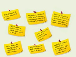 Los deportes urbanos consisten en la práctica de actividades deportivas que utilizan la infraestructura urbana. Surgen con el proceso de urbanización e industrialización y se adaptan a las características de las ciudades. Algunos ejemplos principales son el skateboard, el futbol callejero, el parkour y el rapel.