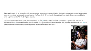 Dua Lipa es una cantante y compositora británica que comenzó a subir versiones de canciones a YouTube a los 14 años. Firmó con Warner Music Group en 2015 y lanzó su primer sencillo. Desde entonces ha tenido éxitos como "Hotter than Hell" y colaboraciones con artistas como Sean Paul y Martin Garrix, ganando popularidad en rankings musicales de varios países.