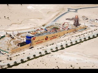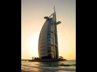 El documento describe el rápido desarrollo urbanístico y de construcción que ha experimentado Dubai en las últimas décadas, incluyendo la construcción de rascacielos, islas artificiales, complejos hoteleros y parques temáticos. Se destaca que Dubai se ha convertido en el centro de grandes proyectos arquitectónicos y turísticos a nivel mundial, y se espera que continúe creciendo rápidamente con nuevos desarrollos planeados como Dubailand y el puerto de Dubai.