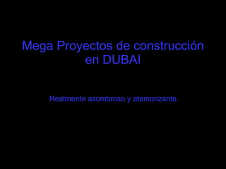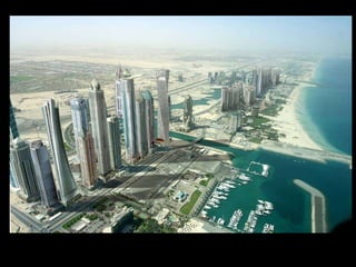 El documento describe los ambiciosos proyectos de construcción en Dubai, incluyendo rascacielos como el Burj Dubai, el edificio más alto del mundo; islas artificiales como las Islas Palmera; y parques temáticos como Dubailandia, que será el doble de tamaño que Disney World. La mayoría de estos proyectos se completarán entre 2008 y 2010 y transformarán a Dubai en un importante centro turístico y financiero mundial.
