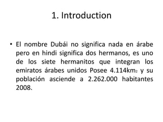 El documento resume la ubicación, religión, gobierno, atracciones turísticas y economía de Dubái. Dubái se encuentra en la península Arábiga en los Emiratos Árabes Unidos, limita con Omán y Arabia Saudita. La mayoría de la población es musulmana, ya sea sunita o chiita. El sistema de gobierno es una federación de monarquías islámicas. Las principales atracciones turísticas son el Burj Khalifa y la zona financiera. La economía se basa en la refinación de
