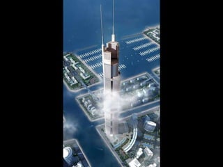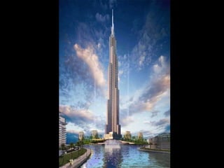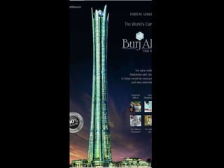 Este documento describe los grandes proyectos de construcción e infraestructura que se han llevado a cabo y se planean en Dubai en las últimas décadas, transformando la ciudad. Se destaca la construcción de islas artificiales en forma de palmera, rascacielos como el Burj Dubai y el Burj Khalifa, y el complejo turístico Dubailand, que superará al Walt Disney World Resort. La mayoría de estos proyectos ambiciosos se han completado o se completarán para 2010, cementando el estatus de Dubai como una de las ciud