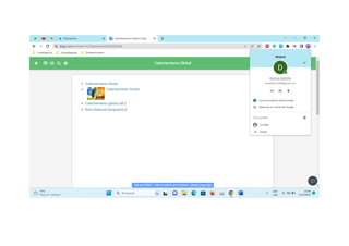 El documento presenta 5 imágenes capturadas de diferentes herramientas de navegación y gestión de información en la web como el administrador de favoritos, la biblioteca de Diigo con contenidos sobre calentamiento global, los esquemas de Diigo sobre el mismo tema, la creación de un equipo de trabajo y los resultados de una búsqueda sobre contaminación y calentamiento global.