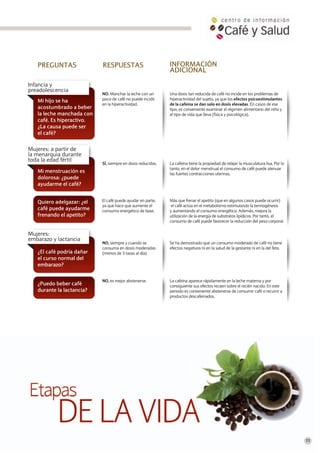 Este documento proporciona información sobre los efectos del café en la salud y responde a preguntas frecuentes planteadas por pacientes a médicos. Se resumen estudios científicos que muestran que un consumo moderado de café diario (3-4 tazas) puede tener beneficios para la salud y no dañar a mujeres embarazadas o en periodos como la menopausia. El café también puede ayudar a estudiantes, deportistas y personas mayores a mejorar su rendimiento.