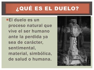El duelo es un proceso natural que las personas experimentan ante diversas pérdidas, incluyendo la muerte de seres queridos, pérdida de salud, y relaciones. Las fases del duelo, según Kübler-Ross, incluyen negación, ira, negociación, depresión y aceptación. Estrategias para ayudar a quienes están en duelo incluyen ofrecer escucha activa, acompañamiento y respeto por su dolor.