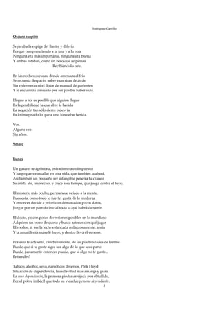 Este documento contiene varios poemas cortos que exploran temas como la soledad, la dependencia, la identidad y la mortalidad. Los poemas usan imágenes crípticas y reflexiones filosóficas para examinar la condición humana de una manera profunda y a veces oscura.