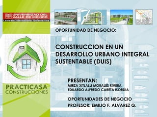 Este documento describe una oportunidad de negocio para construir un Desarrollo Urbano Integral Sustentable (DUIS) en Coatzacoalcos, Veracruz. Actualmente no existen proyectos de vivienda sustentable de interés social en esta área. Un DUIS podría aprovechar este nicho de mercado al ofrecer una mejor calidad de vida a través de viviendas sustentables a un precio accesible. El documento analiza la demanda, oferta y competencia para este tipo de proyecto en la región.