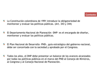 1) El documento describe el proceso de seguimiento de políticas públicas en Colombia según la Constitución de 1991.