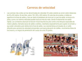 El documento proporciona información sobre diferentes eventos de atletismo como carreras de velocidad, vallas, relevos y sus reglas. Explica los récords mundiales y olímpicos de varias pruebas como los 100 metros, los 3000 metros con obstáculos y los 4x100 metros relevos.