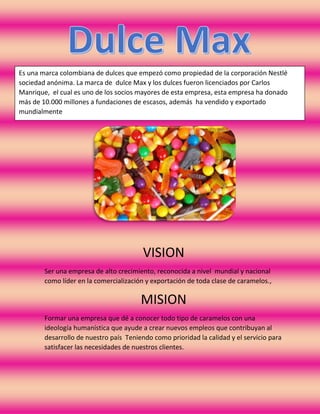 Dulce Max es una empresa colombiana dedicada a la producción y comercialización de dulces. Su visión es convertirse en líder mundial y nacional en la industria de los dulces. Cuenta con plantas de producción en Colombia y presencia en varios países. Ofrece una variedad de productos como galletas, helados y chocolates dirigidos a todo tipo de consumidores. Sus principales accionistas aportan capital mensual para cubrir gastos operativos.