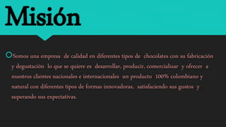 Dulce Sabor Ltda. es una empresa colombiana dedicada a la fabricación y comercialización de chocolates de alta calidad, buscando satisfacer los gustos de sus clientes a nivel nacional e internacional. La visión de la empresa es convertirse en líder en el mercado por su producción y sabor, mientras mantiene un compromiso con la mejora continua y un buen ambiente laboral. Ofrecen una variedad de productos innovadores como fresas cubiertas de chocolate, tortas, cupcakes y donas.