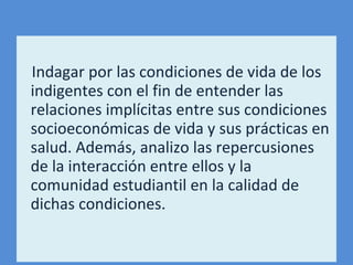 El documento analiza las condiciones de vida de los indigentes en Colombia a través de entrevistas y observaciones. Describe que más de 8 millones de personas viven en condiciones de indigencia, caracterizadas por la delgadez, suciedad, vestimenta harapienta y deficiencias nutricionales. Los indigentes suelen consumir en exceso harinas, dulces y drogas, y tienen mayor riesgo de enfermedades. Además, carecen de vivienda adecuada y oportunidades sociales.