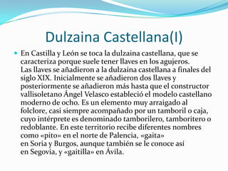 Este documento describe diferentes tipos de dulzainas tradicionales de Castilla y León. Explica que la dulzaina castellana moderna tiene ocho llaves y generalmente se acompaña de un tamboril. También menciona que en algunas regiones se le conoce como "pito" o "gaita". Por último, señala que el "pito castellano" es una versión más suave de la dulzaina que permite practicar en entornos no insonorizados.