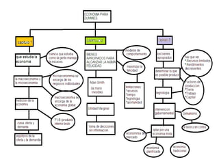 Este documento resume conceptos clave de economía, incluyendo las partes que estudia la economía, cómo rastrear la elección del consumidor, y cómo producir los bienes apropiados para maximizar la felicidad. Explica macroeconomía y microeconomía, el modelo de comportamiento humano que guía la elección, y factores como recursos limitados y rendimientos decrecientes que afectan la producción.