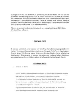 Duolingo es un sitio web y aplicación gratuita para aprender idiomas de forma interactiva y colaborativa. Fue creado por Luis von Ahn y Severin Hacker y ofrece cursos de español, inglés, francés, alemán, portugués e italiano. Los usuarios aprenden un idioma completando actividades y ayudan a traducir textos de Internet, lo que mejora el aprendizaje colaborativo.