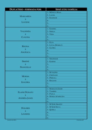 Este documento lista las duplas y tríos de profesoras visitantes en la Estaca Vitória Brasil. Proporciona los nombres de las profesoras asignadas a cada dupla o trío, así como los nombres de cualquier hermana o familia que puedan estar asignadas con ellas. La lista contiene los nombres de más de 50 profesoras asignadas en duplas o tríos para enseñar en agosto de 2011.