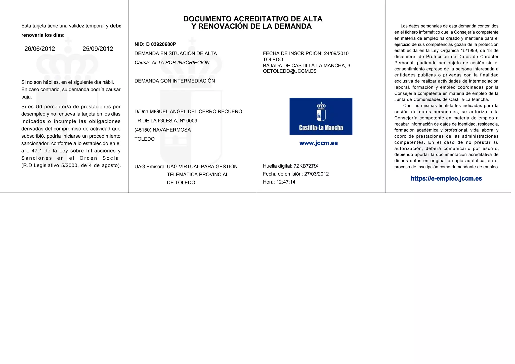 Este documento es una tarjeta acreditativa de alta y renovación de demanda de empleo. Proporciona información personal del demandante como su nombre, dirección y fecha de inscripción. También indica las fechas en las que debe renovar la tarjeta para mantener su condición de demandante de empleo y las posibles consecuencias de no hacerlo como la pérdida de prestaciones o un procedimiento sancionador. Finalmente, autoriza a la consejería competente en empleo a recabar y ceder datos personales con fines de intermediación laboral,