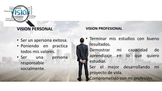 Este documento presenta la visión y misión personal y profesional de un individuo. Su visión personal incluye ser exitoso practicando sus valores y siendo socialmente responsable. Su visión profesional comprende terminar sus estudios con buenos resultados, demostrar su capacidad de aprendizaje y ser el mejor desarrollando su proyecto de vida. Su misión personal implica definir sus objetivos, buscar soluciones y tener confianza en sí mismo. Su misión profesional consiste en lograr sus metas con esfuerzo, ser competitivo y líder, y ser