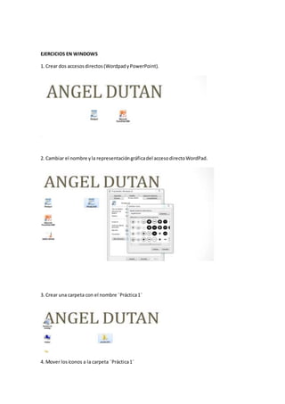 Este documento presenta una lista de 30 ejercicios prácticos relacionados con el uso de Windows que un estudiante de primer año de ciencias sociales debe completar para su clase de informática aplicada a la educación. Los ejercicios incluyen crear accesos directos, organizar carpetas y archivos, personalizar la interfaz de usuario, configurar opciones de red y proxy, y utilizar herramientas como Paint y el grabador de sonido.