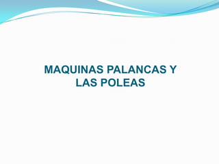 Este documento describe diferentes tipos de máquinas, incluyendo palancas y poleas. Explica que las poleas son máquinas simples que se usan para transmitir fuerza y reducir el esfuerzo necesario para mover un peso. Describe las partes principales de una polea y clasifica diferentes tipos como poleas simples, fijas, móviles y compuestas. También cubre poleas de transmisión y engranajes, explicando cómo se usan para transmitir movimiento entre ejes separados.