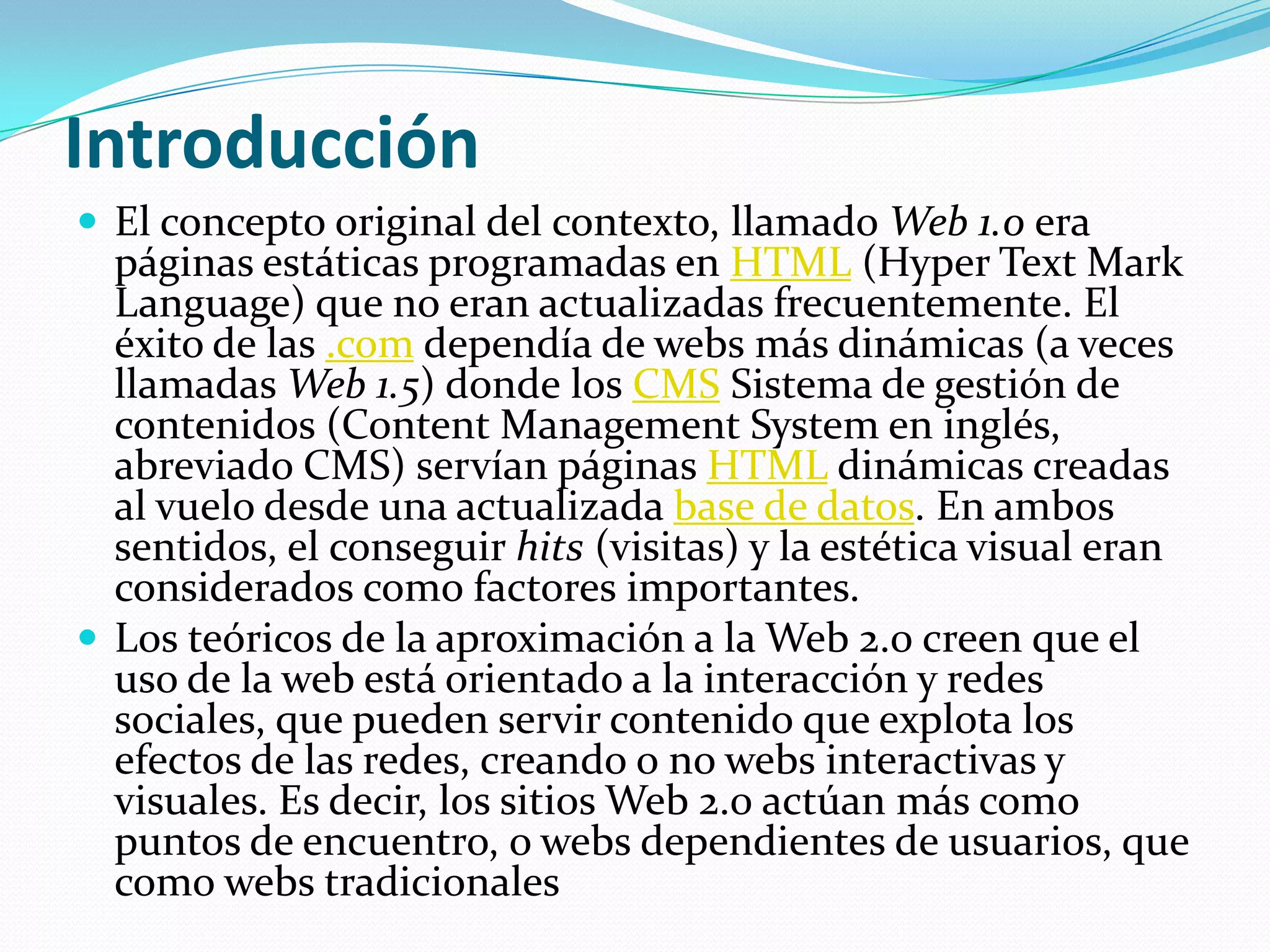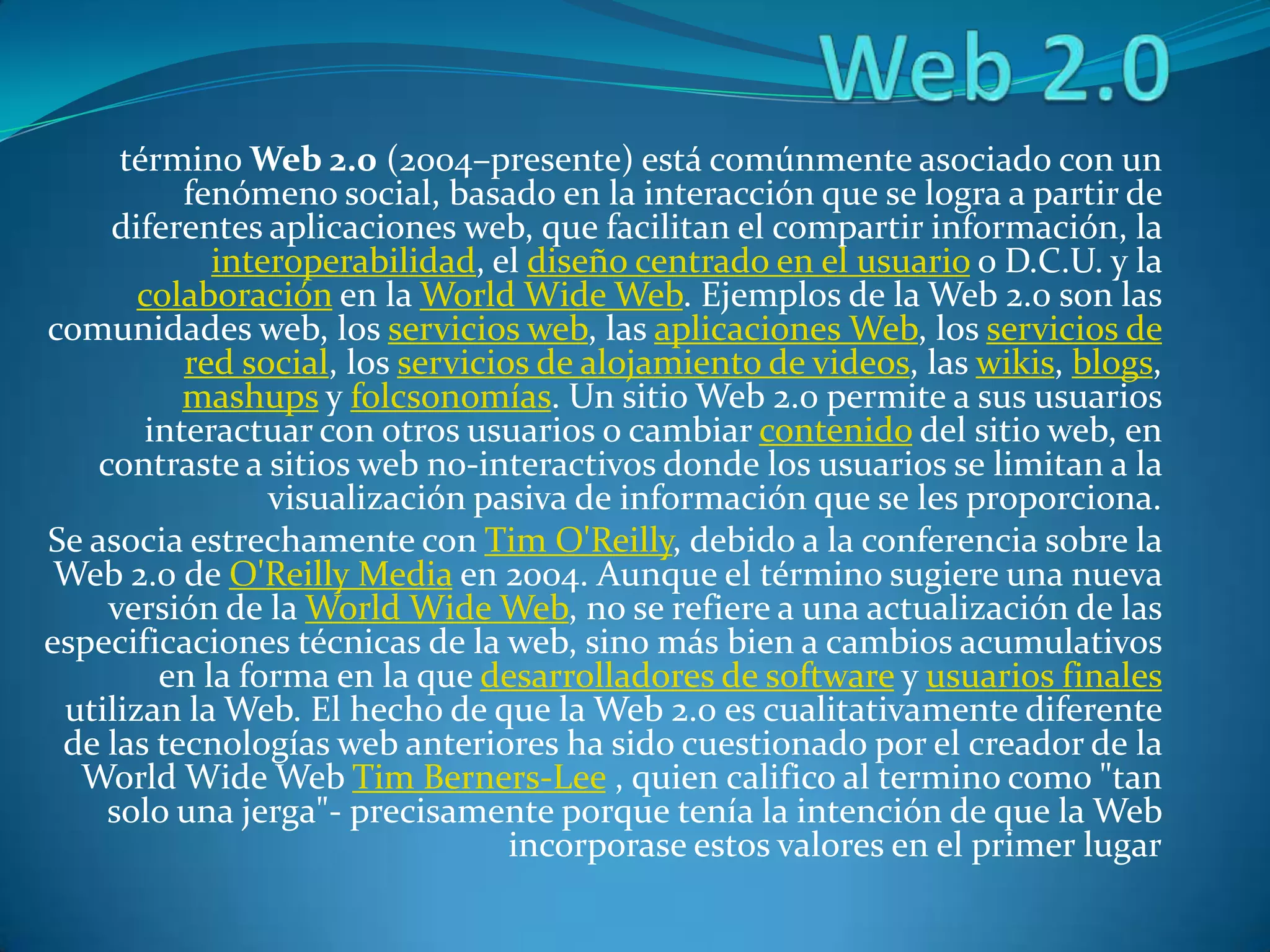 La Web 2.0 se refiere a cambios en la forma en que los usuarios interactúan y comparten información en la World Wide Web, incluyendo comunidades en línea, wikis, blogs y redes sociales. Permite a los usuarios cambiar y actualizar contenido en lugar de solo ver información de forma pasiva. Aunque el término sugiere una nueva versión de la web, realmente se refiere a cambios en cómo los desarrolladores y usuarios usan la web de forma interactiva y colaborativa.