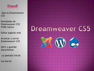 Dreamweaver CS5 es un software que permite crear páginas web de forma sencilla y visual sin necesidad de codificar a mano, a través de funciones de edición que agregan diseño y funcionalidad rápidamente. Permite crear tablas, editar marcos, trabajar con capas e insertar comportamientos, entre otras opciones. Su interfaz incluye barras de menús, herramientas y paneles que brindan una vista del diseño y el código de las páginas web.