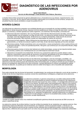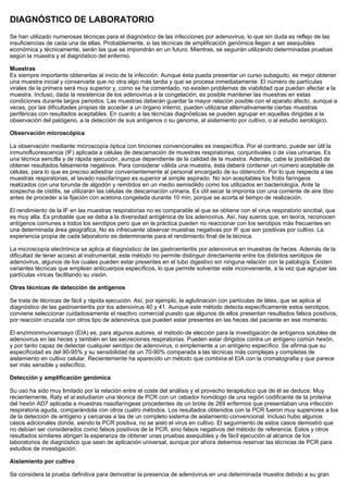 Este documento describe las infecciones por adenovirus, incluyendo sus síntomas clínicos más comunes, morfología, y métodos de diagnóstico de laboratorio. Las infecciones por adenovirus pueden afectar los tractos respiratorio, digestivo, ocular, genitourinario e inmunocomprometidos, causando enfermedades como faringitis, gastroenteritis, conjuntivitis, cistitis y neumonía. Los adenovirus tienen una nucleocápsida icosaédrica con ADN protegido y fibras de adhesión antig