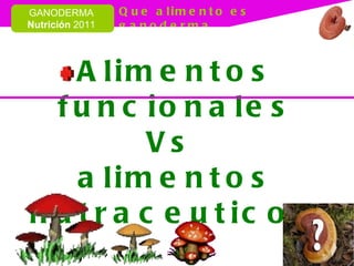 El documento describe la evolución del concepto de alimentos funcionales, desde alimentos medicinales en la antigua China hasta su definición moderna. Explica que los alimentos funcionales son aquellos que pueden beneficiar la salud más allá de sus nutrientes tradicionales. También resume los diferentes tipos de alimentos funcionales existentes y sus beneficios potenciales para la salud.